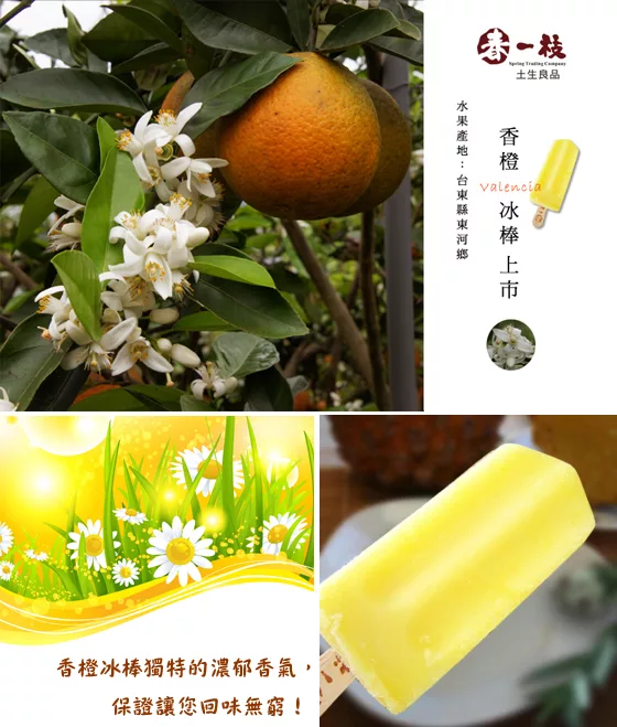 春一枝香橙冰棒採用來自台東特有的柑橙品種-晚倫西亞(Valencia)製作而成。