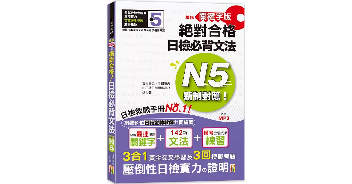 →→→→更多詳細”精修關鍵字版 新制對應 絕對合格!日檢必背文法N5 附三回模擬試題(25K+MP3)”介紹請點我