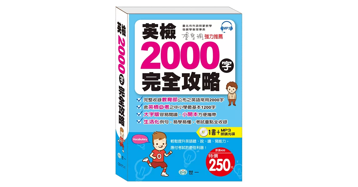 博客來-英檢2000字完全攻略:附MP3 2000 Essential Words(附MP3光碟(DVD)1片)訂購網址: https://www.books.com.tw/exep/assp.php/87926/products/0010751943?utm_source=87926&utm_medium=ap-books&utm_content=recommend&utm_campaign=ap-201906