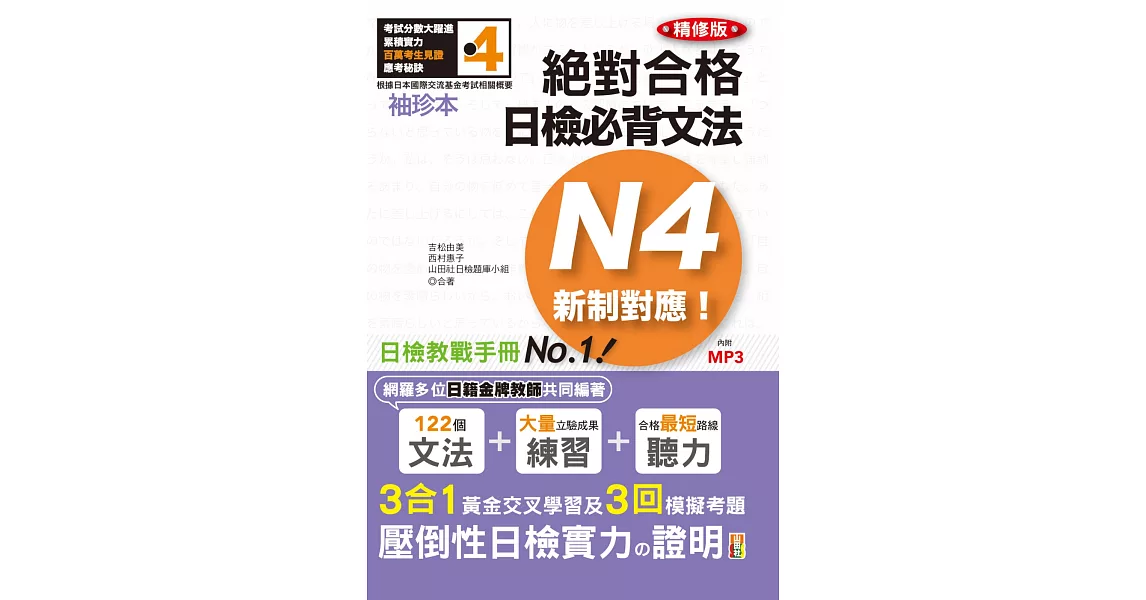 博客來-袖珍本 精修版 新制對應 絕對合格!日檢必背文法N4(50K+MP3)訂購網址: https://www.books.com.tw/exep/assp.php/87926/products/0010736304?utm_source=87926&utm_medium=ap-books&utm_content=recommend&utm_campaign=ap-201906