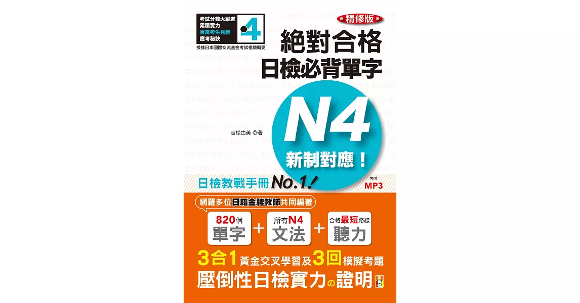 博客來-精修版 新制對應 絕對合格!日檢必背單字N4(25K+MP3)訂購網址: https://www.books.com.tw/exep/assp.php/87926/products/0010717927?utm_source=87926&utm_medium=ap-books&utm_content=recommend&utm_campaign=ap-201906