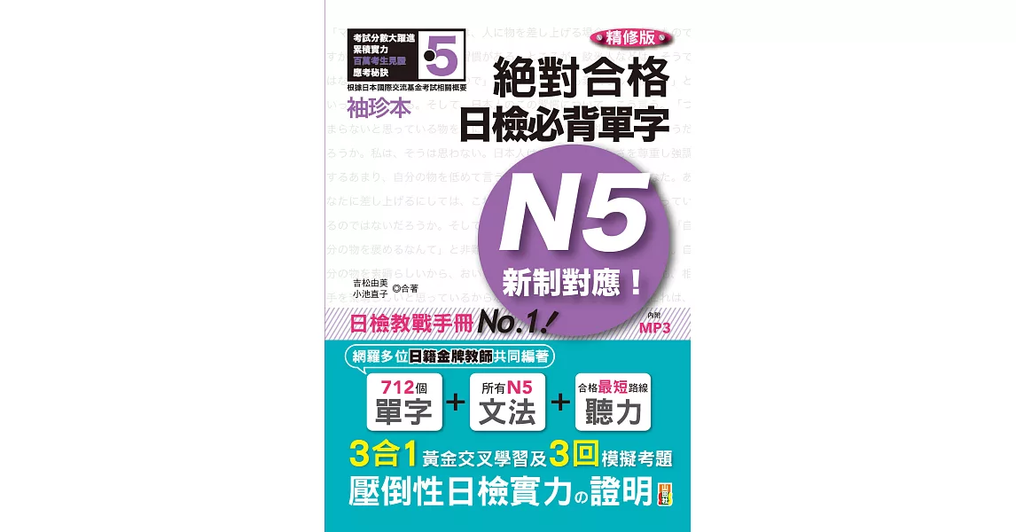 博客來-袖珍本 精修版 新制對應 絕對合格!日檢必背單字N5(50K+MP3)訂購網址: https://www.books.com.tw/exep/assp.php/87926/products/0010731707?utm_source=87926&utm_medium=ap-books&utm_content=recommend&utm_campaign=ap-201906