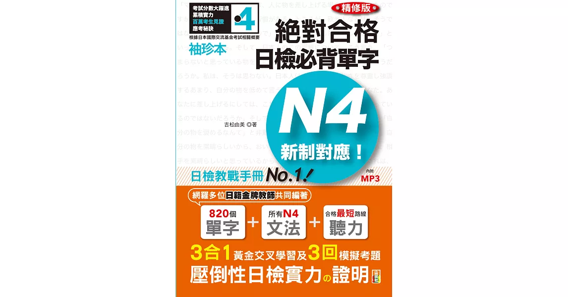 博客來-袖珍本 精修版 新制對應 絕對合格!日檢必背單字N4(50K+MP3)訂購網址: https://www.books.com.tw/exep/assp.php/87926/products/0010731701?utm_source=87926&utm_medium=ap-books&utm_content=recommend&utm_campaign=ap-201906