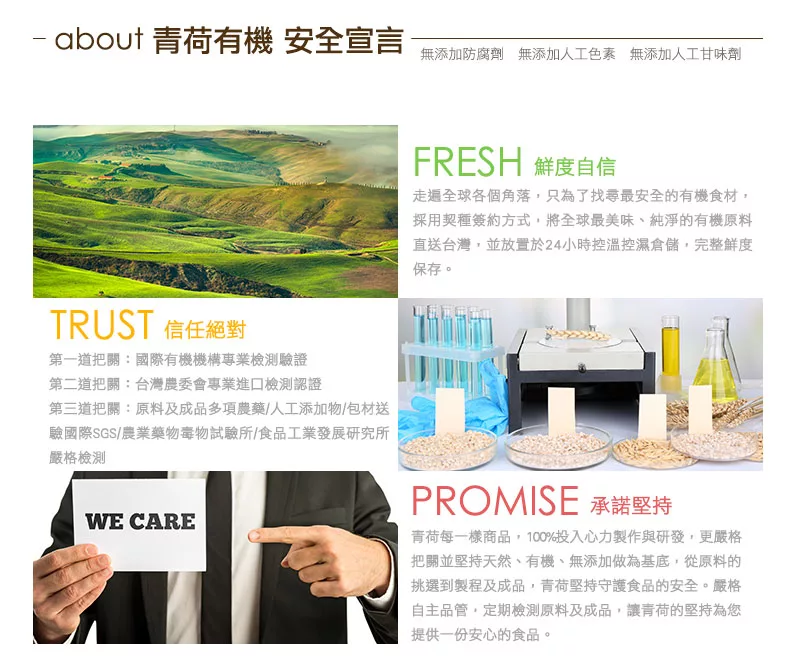 嚴選有機食品,完全採用有機農法種植作物,不使用農藥、化學肥料及任何人工添加物,完整保留有機食品的天然成份,照顧全家人的身體,也愛護地球的每一寸土地。