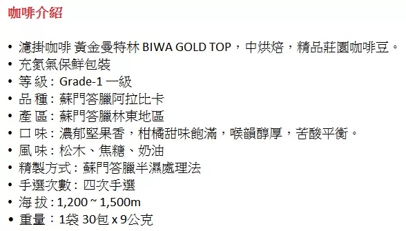 →→→→更多詳細”【中霏 NANFE咖啡】黃金曼特林 濾掛咖啡 1袋30包 X 9公克”介紹請點我